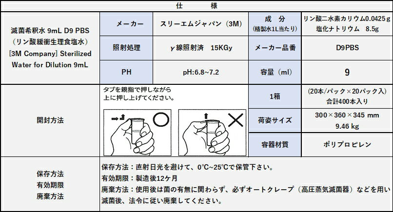 購入には法人名、事業所名が必要です。 表記の発送予定よりお時間を頂く場合があります。宅配便発送ではありません。時間指定等にはご希望に添えない場合があります。 あらかじめご理解・ご了承お願い申し上げます。 メーカーの予告なく商品名・ラベル等が改訂される場合があります。このため、実際にお届けする商品サイト情報の表記が異なる場合があります、ご使用前には必ず商品の商品ラベルや注意書きをご確認ください。 ●帳票(領収書・納品書)前項の各種帳票希望よりご依頼下さい。 商品は直送の為、 代金引換及び当店内他の商品と同梱できません。 商品区分 滅菌水 商品名: 滅菌希釈水 9mL 100本入り、400本入り(20×20) 成分 精製水1L当たりリン酸二水素カリウム0.0425g 塩化ナトリウム 8.5g 特徴 1mLの検体希釈水を加え、段階希釈をする際に使用。 片手でフタの開閉できます。 【注意事項】 ●商品は法人または事業所向け。一般・個人販売できません。 販売 【販売店】株式会社ジェイエスエルシー〒599-0212 大阪府阪南市自然田1541-6 TEL:072-493-8506/FAX:072-493-8507Neogen® 滅菌希釈水 9mL D9 PBS (リン酸緩衝生理食塩水)片手で簡単に開封できるワンタッチタイプなので、作業性向上・1mL刻みの目盛り付き容器なので、正確に希釈できます。・口径が広いので、ピペットが接触しにくいです。・自立できる安定した形状です。 ●事業者の方は法人名または事業所名お知らせください。 商品は北海道・沖縄県・離島・その他一部地域で配送追加料金が発生します。 地域等によっては、お届けできない場合もございますのでご了承ください。 ご注文後、発送出来ない事が判明した場合、ご連絡させて頂きます。 【注意】直送品のため、以下の点ご確認下さい。 ・領収書 発送後翌日楽天市場購入履歴より発行できます。 ・納品書・請求書をご希望のお客様は、当社よりPDFファイル送信または郵送をお選び下さい。 ・お客様のご都合によるご注文後の変更・キャンセル・返品・交換はできません。 ・商品のご注文後に商品が発送出来ない事が確認された場合、ご注文をキャンセルさせていただくことがあります。 ・ご注文後に商品の品切れが確認された場合は、メーカー在庫入荷時の発送となります。 ・代金引換及び当店内他の商品と同梱できません。年末発送 月 日まで・年始1月 日より発送可能