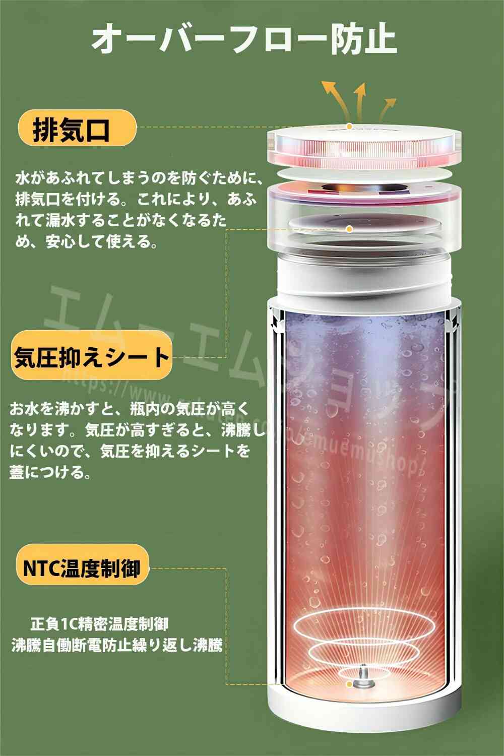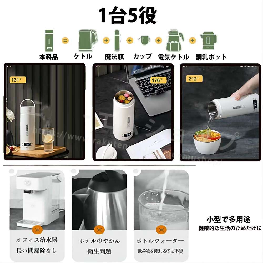 ポータブル電気ケトル本品はケトルとカップの機能が1つに集まるので、持ち運びやすくて省スペースです。サイズは80*230mmで、対応の収納バッグが付属しています。本体(電源コードを含まず)の重量はたった440gで、とても軽量で便利です。またコーヒー、紅茶など作れます。旅行や出張にぴったりです安全・速沸5分ですぐに沸騰するタイプです。沸騰すると自動電源オフ。このポータブルケトルは自動オーフ&空焚き防止機能が付くので目を離せても大丈夫です。蓋を閉めたままお湯を沸かすことが可能で、オーバーフローを有効的に防止します。また、3層構造なので、火傷を防止します。健康的で多機能この電気ケトルは高品質な食品接触用304ステンレス鋼を採用し、お湯を飲んでも安全で、耐久性があり、掃除も簡単です。赤ちゃんのお湯、お茶、コーヒー、おやつ、ミルクをいつでも用意できます。 外出先でも、職場でも、ホテルでも、自宅にいるような気分になりますお手入れが簡単付属のお手入れブラシで、汚れが簡単に取れます。メーカー希望小売価格はメーカーサイトに基づいて掲載しています。