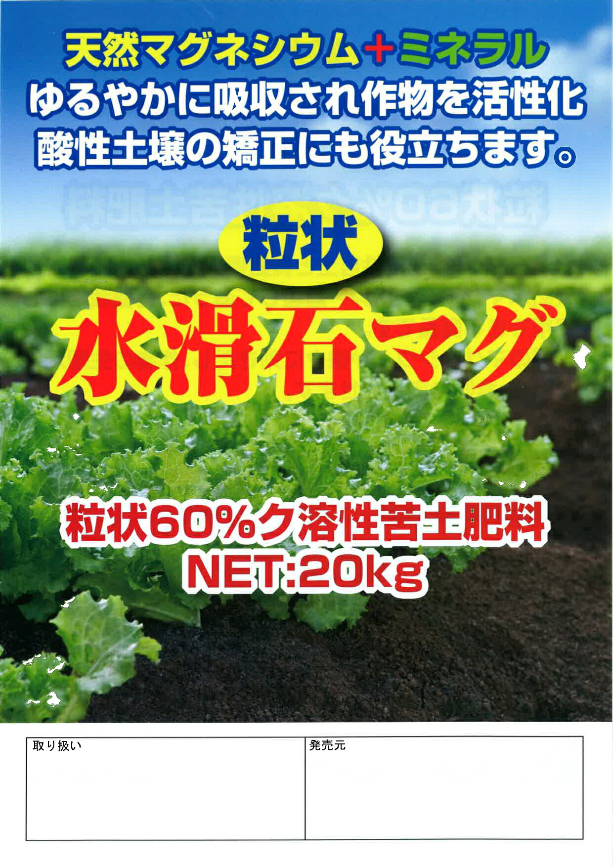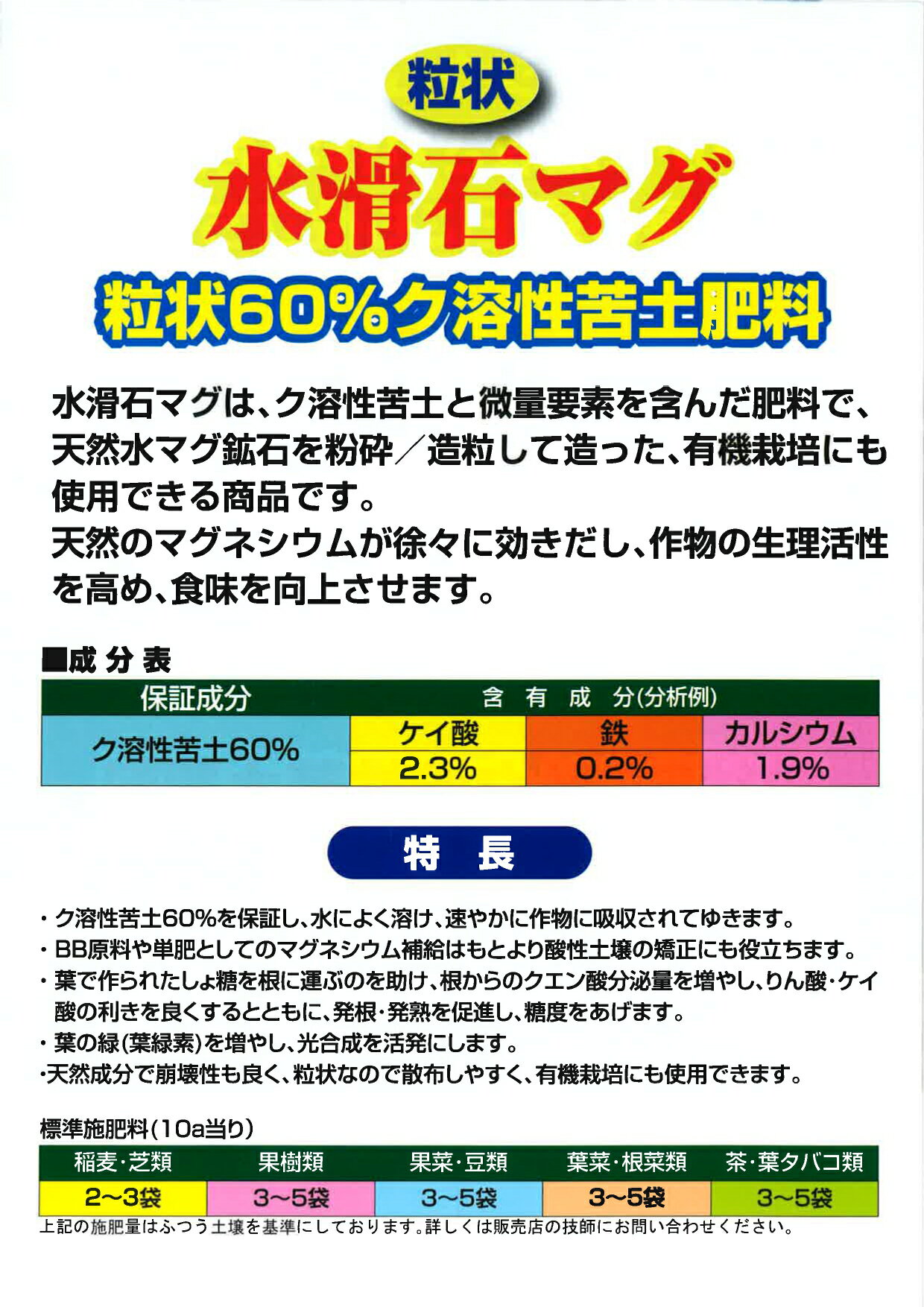 肥料の種類 水酸化苦土肥料 肥料の名称 水酸化苦土肥料60 登録番号 輸 第100225号 原料 水滑石 保証成分 く溶性苦土60% 正味重量 20kg 水滑石由来の緩効性苦土肥料です。マグネシウムは葉緑素の原料であり肥料5大要素の一つですが、。心配なのは与え過ぎ。根や微生物の働きで徐々に分解されていく肥料ですので、一般的条件下で肥効が約120日持続しますから長期間持続するマグネシウム肥料としてこちらをお選び下さい。 これはMg単肥ですので、組み合わせは窒素肥料として蒸製羊毛粉やかつおくん、リン酸肥料として焼成骨粉、カリ肥料として重炭酸カリちゃん、微量要素として医王さんをおすすめします。