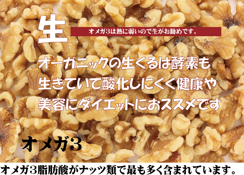 リノール酸、ビタミンB1豊富 ■無農薬栽培くるみ 無塩・添加物は無添加 ■ビタミンB群・E、鉄、リノレン酸 ■素材の甘味と旨味がかみしめるほどに ■クルミ和えやパン、ケーキの材料などに ■無農薬栽培ウォールナッツ(有機ウォールナッツ(アメリカ産) ●60g×3個生くるみは『植物性の卵』とも呼ばれ、 栄養素の65%を占める脂質に、 リ ノール酸やリノレン酸などの良質な 不飽和脂肪酸を生くるみは 損なうことなく多く含んでいます。 また酸化はローストしたとたんに 始まります。 健康に良いと今注目を浴びている オメガ3脂肪酸がナッツ類で最も多く含まれています。 他、タンパク質やビタミンB1、ビタミンE、 食物繊維、マグネシウムといった栄養素が ギュッと詰まっています。 無添加・生ですので、 くるみに含まれているすべての 栄養素を失うことなく 摂取することができます。 この「くるみ」は ★農薬不使用 ★化成肥料不使用 ★安定剤不使用 ★輸入時害虫検査等の燻蒸処理無し ★食品添加物無添加 ★塩不使用 ★オイル不使用 ★有機認証取得品 ★人工的加熱処理無し ★加熱処理無し ★アメリカ産オーガニックくるみ使用 なので安心安全です。