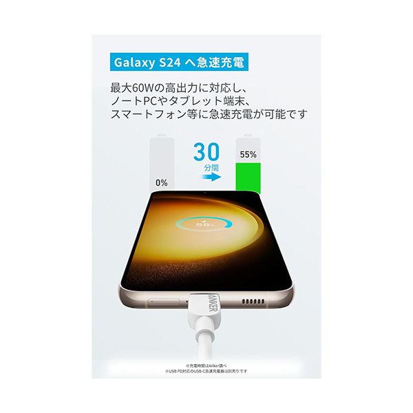 ■商品内容【ご注意事項】この商品は下記内容×5セットでお届けします。●最大60Wの高出力に対応し、ノートPCやタブレット端末、スマートフォン等の幅広いUSB-C機器に急速充電が可能。長さ1.8m、色はブラックです。●PD対応の充電器と共に使用することでSamsung Galaxy S23Ultraにわずか30分で55%まで充電することが可能。●10000回以上の折り曲げにも耐える優れた耐久性を実現しているため、ケーブル内部のワイヤーを断線から保護し、安心して充電することができます。●USB-IF準拠に加え、厳格な品質検査を実施しており、お使いのUSB-C端子機器を安全にかつ急速充電していただけます。■商品スペック色:ブラックコネクタ形状:USB-C-USB-Cケーブル長さ:約1.8mケーブルタイプ:CCタイプその他仕様:●出力:最大60W●付属品:18ヵ月保証+6ヵ月(Ankerで会員登録後)、カスタマーサポート●保証期間:18ヵ月備考:※本製品はデータ転送および充電にのみ対応し、映像出力には対応しておりません。■送料・配送についての注意事項●本商品の出荷目安は【5 - 11営業日 ※土日・祝除く】となります。●お取り寄せ商品のため、稀にご注文入れ違い等により欠品・遅延となる場合がございます。●本商品は仕入元より配送となるため、沖縄・離島への配送はできません。[ A81E6011 ]
