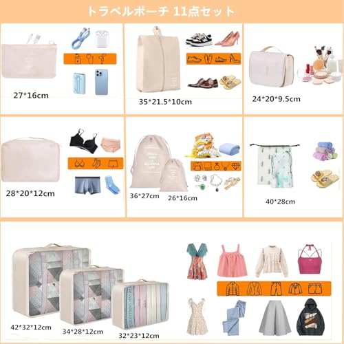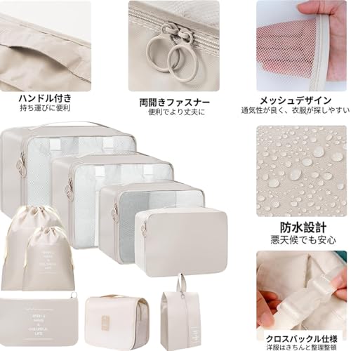 ◆商品名:トラベルポーチ 11点セット 旅行用 ポーチセットおしゃれ アレンジケース パッキングポーチ 衣類収納 出張 整理 便利グッズ 靴用 下着収納 洗面用具 シューズ 小物入れ 軽量 防水 大容量 収納 旅行用便利グッズ(ベージュ)【トラベルポーチ 11セット】衣類収納ポーチ×4、化粧ポーチ×1、小物入れポーチ × 1、シューズバッグ×1、巾着袋 ×2、汚れた衣類用のランドリーバッグ×2。11点セットのトラベルポーチがあるから、細かく分けてすっきり整理でき、収納が抜群です。物を納めるだけではなく、靴、洗面用具、雑物とよく使う小物、汚い服ときれいな服などを区別して収納できます。スーツケースのなかもすっきりします。【高品質素材】良質なポリエステル材料を採用、防水、防塵、軽量の特徴を持ち、携帯に便利です。かつ繰り返し使用可能で、経済的実用性があります。バックルストラップのデザインが、お洋服をすっきりまとめてくれます。持ち運びに便利なハンドルも付いております。三つのメッシュポーチには上部の蓋がメッシュ素材になっているので、通気性良い、内容物の確認も簡単にできます。丸洗いも可能なので、いつでも清潔に使用できますよ!【多用途に活用できる】トラベルセット 冬ど夏物衣料、毎日の服や、下着、靴、洗面用具、化粧品及び他の小物など何にでも使用できます。旅行、出張や家の整理など収納のニーズに合わせてパッキングキューブを広く使用できます。温泉やスポーツやキャンプなどのアウトドアにもご利用いただけます。性別を問わないユニなデザインです。【便利 折りたため】持ち手付きがあるので、単体でも持ち運びしやすいです。中身が分がるメッシュ生地と開けやすいので、簡単に必要な衣類を探せて、空港での安全検査がさらにスムーズにします。使わないときは折りたためて、あまりにも多くのスペイスを占有しないで、1つの小さなポーチは収納できます。【品質保証】カメラやモニターの性質によって、画像と実物の色の違いがある場合がありますので、ご理解お願いたします。初期不良/未使用(商品到着時の損傷)はいつでも無償交換?返品保証。品質保証期間、もし、製品に何か問題あれば、メールでご連絡してください。 ご連絡の方法:アカウントサービス内の「アカウントサービス」→「注文履歴」→「販売元」→「質問する?から、ご遠慮なくお問合せ下さいますようお願い申し上げます。リスクのない完全な購入をお楽しみください。Fincy Palmooのトラベルバッグを見つけて、スーツケースをきれいに収納したり、衣類、下着、スリッパ、化粧品、カメラ、携帯電話などを整理することができます。 旅行グッズ& あなたのビジネス旅行の完璧なコンパニオンです!