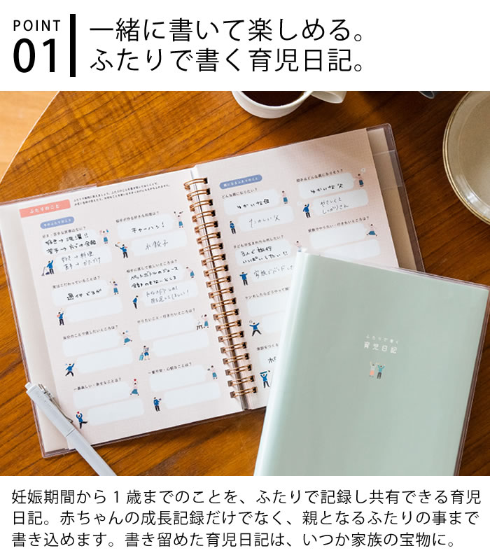 商品名 ふたりで書く育児日記 商品詳細 サイズ 本体:約 W16.2×H21×D2cm カバー:約 W16.8×H21.8×D2cm 重量 約393g 素材 本体:紙、リング:鉄、カバー:塩化ビニール 説明書:紙、帯:紙 仕様 本体(144ページ)、説明書 収録コンテンツ [生まれるまでのことの記録] ・ふたりのこと(2ページ) ・お腹にいるときのこと(7ページ/14ポケット)※エコー写真を入れられます。 [生まれてからのことの記録] ・生まれた日のこと(2ページ) ・毎月のこと(12ページ/12ヶ月分)※毎月1枚の写真を貼れます。 ・はじめての日のこと(2ページ) ・1歳記念を迎えたふたりのこと(1ページ) [毎日のことの記録] ・ダイアリー(106ページ/1週間で1見開きの1年分) ・メモ(フリースペース/6ページ) 原産国 日本 備考 ※ご使用されるペンの種類によっては、インクがにじむ可能性がございます。 ※超音波写真は感熱紙ですので、時間とともに消えてしまう可能性があります。 ※アルバム本体には複 写したものを使用することをおすすめします。 ※コピー機、カラーコピー機、スキャナー等、取り込み時に強い光を受けることで、原版が真っ黒になってしまう可能性がありますので 、感熱紙の取り扱いには十分にご注意ください。 ※エコー写真をカメラで撮影し、プリンター出力されるか、お近くのエコー写真プリントサービスの取扱店にて出力されたものの使用をおすすめします。 検索キーワード 赤ちゃん 記録 いろは出版 ふたりで書く 育児日記 育児 便利 ベビー ダイアリー ギフト 1歳まで パパ ママ 共有 夫婦 記念 マタニティ 妊活 妊婦 日本 おしゃれ かわいい エコー写真 日記 アルバム 男の子 女の子 育児ノート 成長記録 ラッピング ラッピングOKふたりで書く育児日記 赤ちゃんの毎日のリズムを共有♪ふたりで書く育児日記 一緒に喜び、一緒に悩み、ふたりで親になっていく。 妊婦期間から1歳までのことをふたりで記録し共有できる育児日記です。 ミルクの量や睡眠時間、エコー写真、毎月の成長などお子様の成長をしっかり記録できるだけでなく、 これからのふたりのことなどを一緒に楽しめるコンテンツがたくさん。 赤ちゃんのことだけでなく、親となるふたりのことまで書き留めた育児日記は、いつか家族の大切な宝物に。 →シリーズ一覧を見る →シリーズ一覧を見る