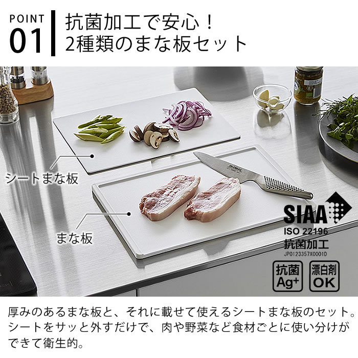 商品名 抗菌まな板&シートまな板セット タワー 商品詳細 サイズ まな板:約 W33×D22×H1cm シートまな板:約 W30.5×D21×H0.3cm 重量 約635g 素材 まな板:ポリプロピレン・エラストマー シートまな板:ポリエチレン 耐熱温度 まな板:170℃ シートまな板:100℃ 耐冷温度 まな板・シートまな板:−40℃ 原産国 中国 備考 ※厚いまな板のみ食洗機でのお手入れが可能です。シートまな板は食洗機には対応しておりません。 ※電子レンジは使用できません。 検索キーワード まな板 食洗機対応 抗菌まな板&シートまな板セット タワー tower 抗菌 まな板 シート まないた 2枚セット カッティングボード 薄い おしゃれ シンプル タワーシリーズ 調理器具 7020 7021 山崎実業 yamazaki ヤマジツ 滑り止め 両面 ラッピング ラッピングOK →詳細はこちら抗菌まな板&シートまな板セット タワー 安心して使える抗菌仕様まな板とシートまな板のセット 抗菌加工で安心! 厚みのあるしっかりしたまな板と、それに載せて使えるシートタイプのまな板の2枚セットです。 シートをサッと外すだけで、肉や野菜など食材ごとに使い分けができて便利。 シートまな板は軽くて柔らかいので、切った食材を鍋に入れやすく調理もスムーズに。 厚みのあるまな板は食洗機対応なのでお手入れも簡単です。 関連商品 抗菌シートまな板 タワー 抗菌まな板&シートまな板セット タワー シンプル&クールな暮らしに「tower」一覧 ナチュラルで優しい空間に「tosca」一覧 暮らしが変わる!マグネット収納 一覧