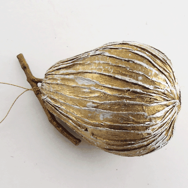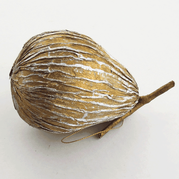 【商品サイズ】 全長:約7cm 実径:約2.5〜5cm 上の軸:自然素材のためサイズはまちまち 材質 :プラスティック 洋なしのオーナメントを6個セットで販売しています。見た感じは、洋なしを金色のペーパーで包んだようになっています。しわ部分が銀色の縦じまになったグレードの高いオーナメントです。