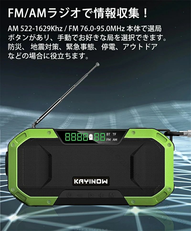 ★【多機能防災ラジオ】●日本PSE認証●AM/FMラジオ受信:AM:522-1629AKHZ FM:76.0-95.0 MHz(居る地域のラジオ情報自動選局機能対応)●ンパクトサイズ:166 * 52 * 78mm●軽量化:約440g(携帯便利)●防水性能:IPX6防水認証済(※水しぶきや少量の雨から本体を守る防滴仕様で使えますが、大雨で使用する場合ご遠慮ください。)●防災システム研究所お勧め標準に合わせる人気防災グッズ★【多様な充電方法対応】●Type-c充電:USB-C充電式で電量が快速に復活できます(充電効率100%向上した)。●ソーラー発電:23.5%の高転換率単結晶シリコンパネル採用、太陽光の下に置くと半永久的に給電が可能です。●手回し充電器:非常時災害用手巻き発電機能付けのてまわしラジオです。★【懐中電灯&読書ランプ】懐中電灯と読書ランプが付きますので、外出時や家の電源がオフのときでも夜間を明るくし、自宅の読書灯としても使え、ルームメイトの邪魔をしません。※本商品は、電波法令で定められている技術基準に適合していることを証明する技適マークが貼付されていない無線機器であり、日本国内で使用する場合は、電波法違反になるおそれがございます。ご使用の際には、十分ご注意いただきますようお願いいたします。詳しくは、最寄りの総務省総合通信局へお問い合わせください。ご注意ください。手回し発電によってスマホに直接充電することはできません。手回し発電は、緊急時にラジオのバッテリーに電力を供給するためのものですので、その点をご了承いただけますと幸いです。 指定された配送時間は承っておりません。【ZUISHIN】
